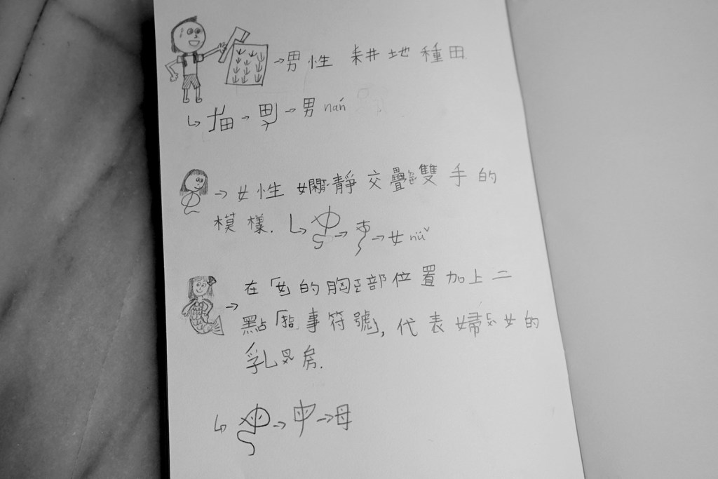 某天的漢字課程中,我們學到了「男」與「女」的造字由來。