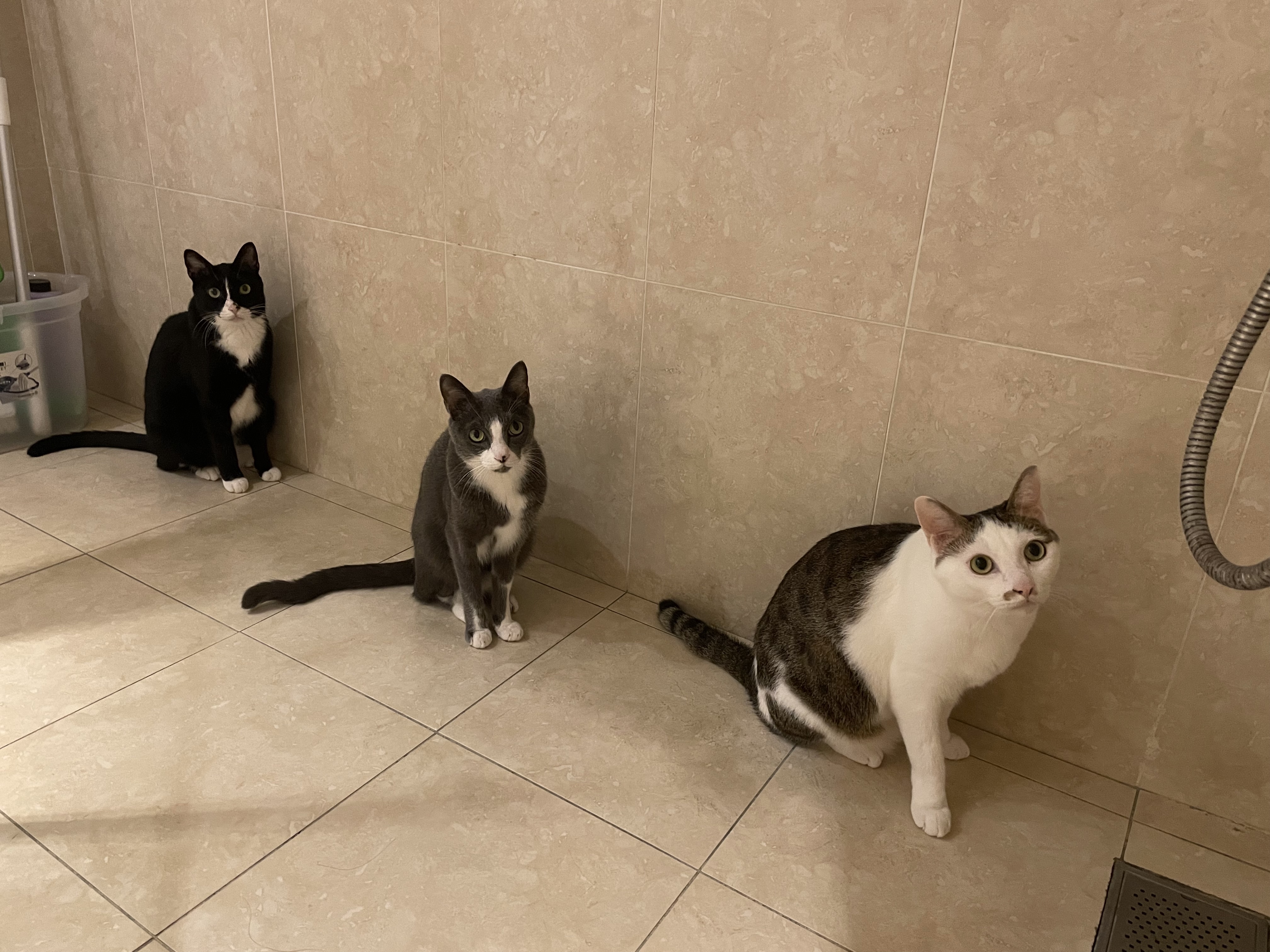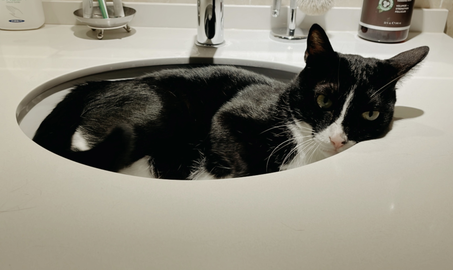 快速洗個澡、有時畫個妝,大概會讓我在浴室待上至少半個多小時,安靜大概一段時間後,開始會有孩子陸續進來探頭探腦,然後開始叫「媽媽,你在幹嘛?為什麼沒有陪我?」有的會貼著我坐在後面,蹭,有的要看我從抽屜拿出來的東西是什麼,有時候,太想獲得注意力,就會乾脆蜷窩在洗手槽裡。「你看我這麼可愛,是不是很想摸兩下?」貓大概不知道雙水槽是什麼意思,所以我會配合摸個兩下,反正不礙事。