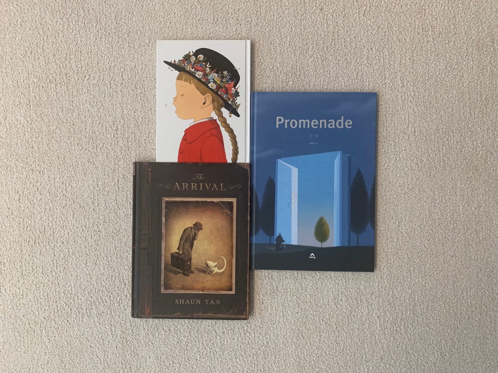 同樣中途轉職,從平面設計師轉為插畫師,並且擅長超現實手法的李炡昊,他的作品不似陳志勇有敍事架構,而是通過隱喻、符號,深耕開發視覺語言這部份,如果喜歡馬格利特的話相信會同樣喜歡他的構思。《漫步》的旅程始於封面,一位穿著修士衣服的的老人提著燈走向一部巨大的書,而這書正為他開啟了大門,接下來到處皆以「書」為風景,它化身成湖泊山巒,也可以是一扇面向內心的窗,有趣的是書中的時間似乎流得特別慢,而那些光影總引人回眸,讀者需要時而漫步、時而駐足觀看。